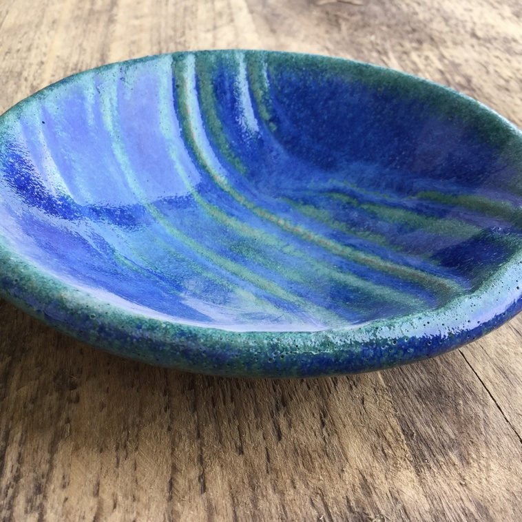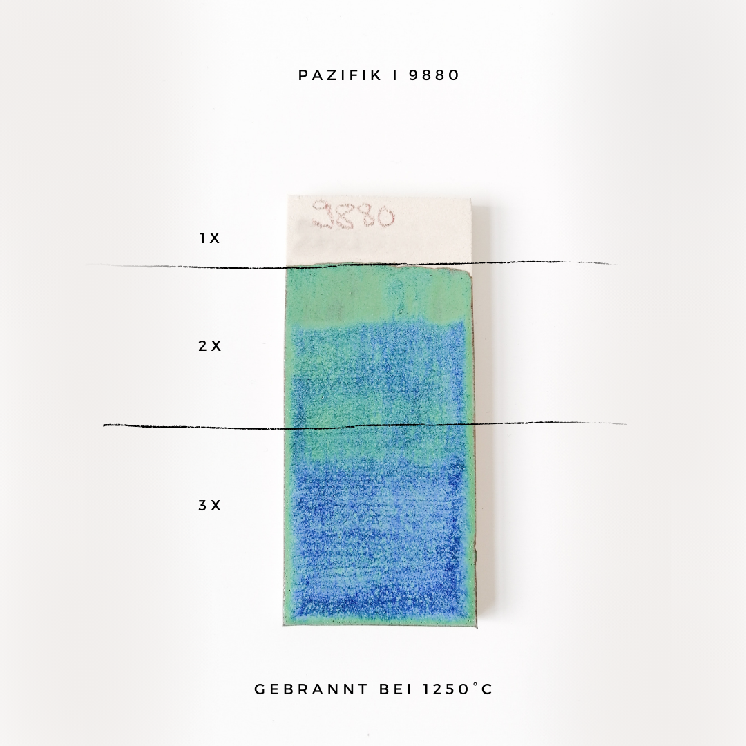 Vidrado de grés brilhante, verde-azulado, com jogo de cores nebuloso, que transita de um elegante verde-lago para um azul-claro intenso.
