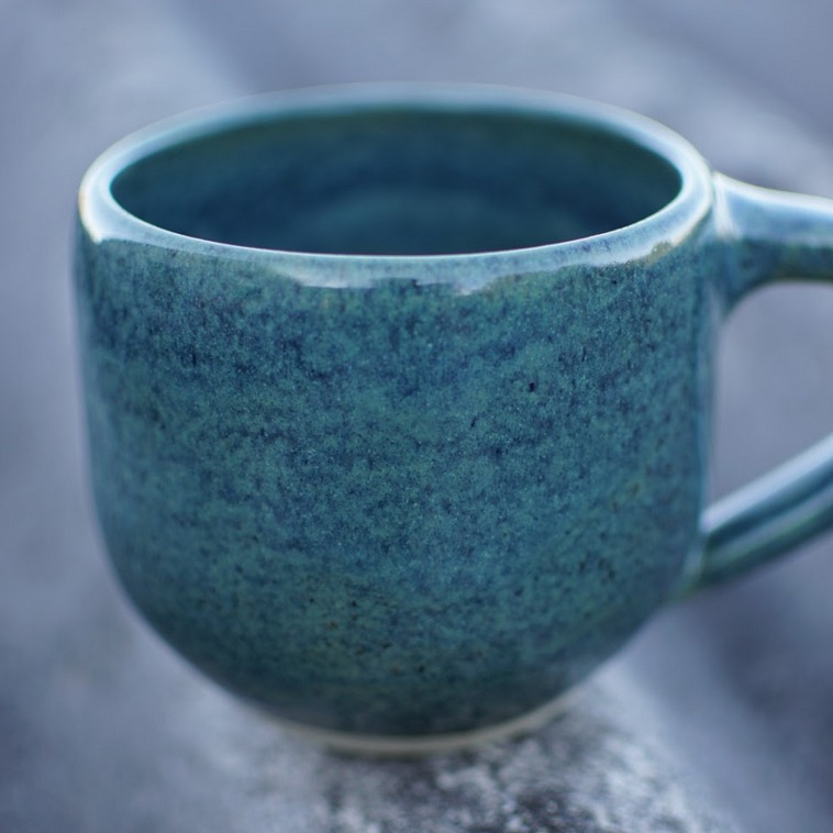 Vidrado de grés brilhante, com variação cromática entre azul-acinzentado e azul-esverdeado, de caráter efeito.