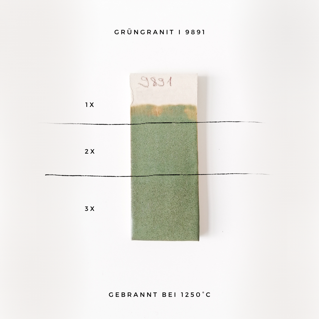 • 1250 °C: verde intenso e acetinado, com finos efeitos claros e escuros