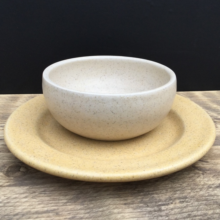 Vidrado de grés amarelo-areia acetinado (sedoso), com finos salpicos pretos.