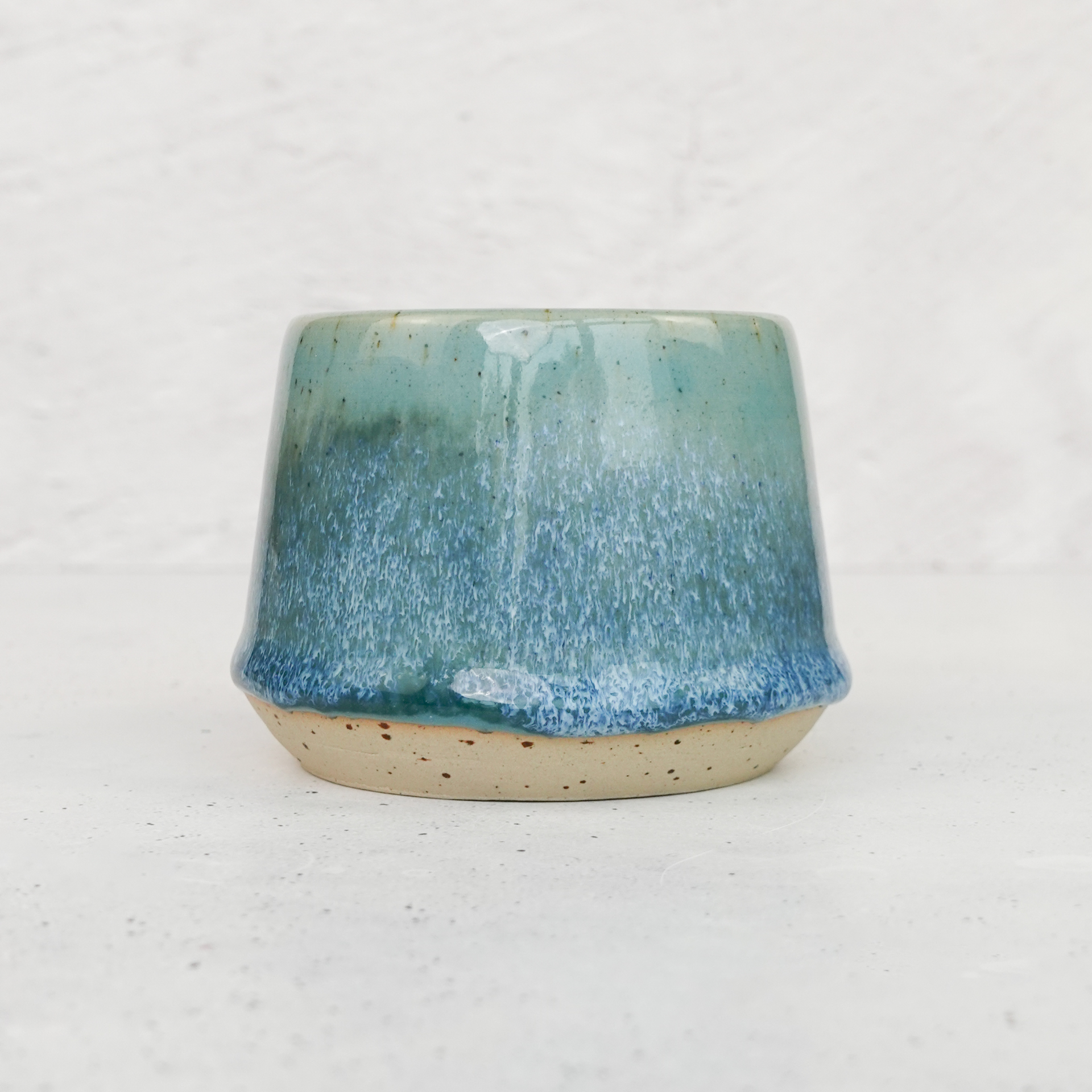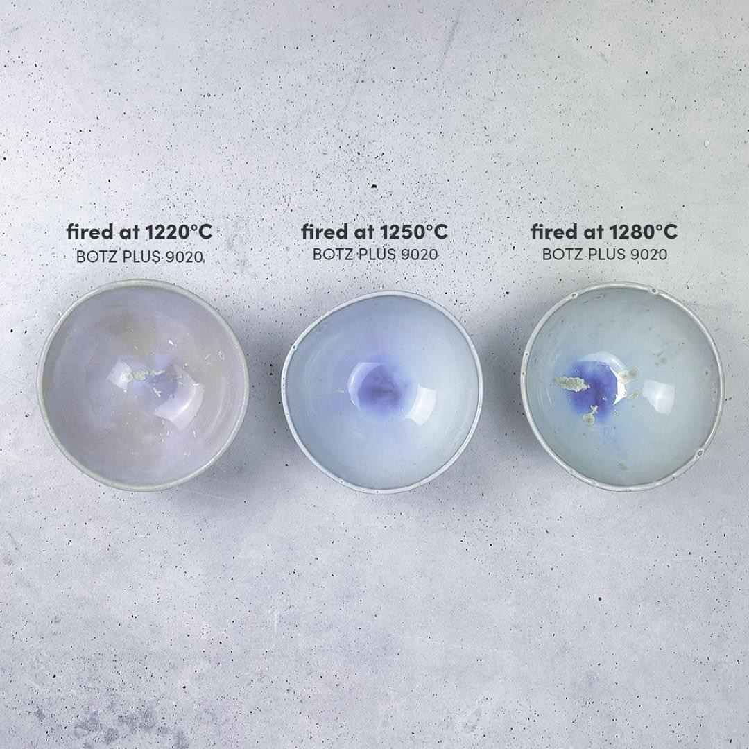 • BOTZ Plus aplicado puro em queima de grés resulta num vidrado brilhante com efeitos cristalinos azulados