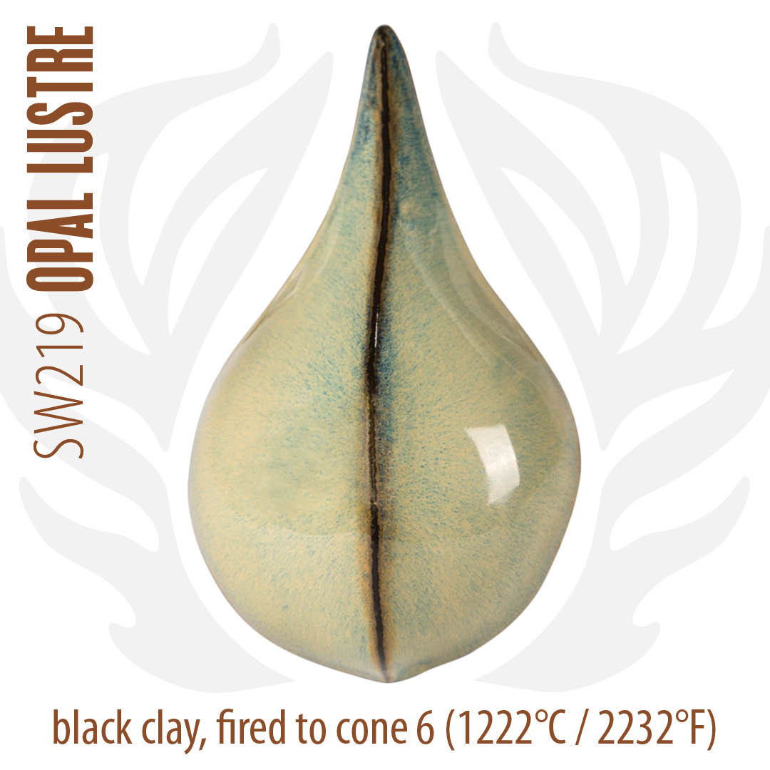 Opal Lustre é um vidrado brilhante e semiopaco que apresenta tonalidades variáveis de azul, verde e roxo. Abre em castanho quente sobre áreas em relevo.