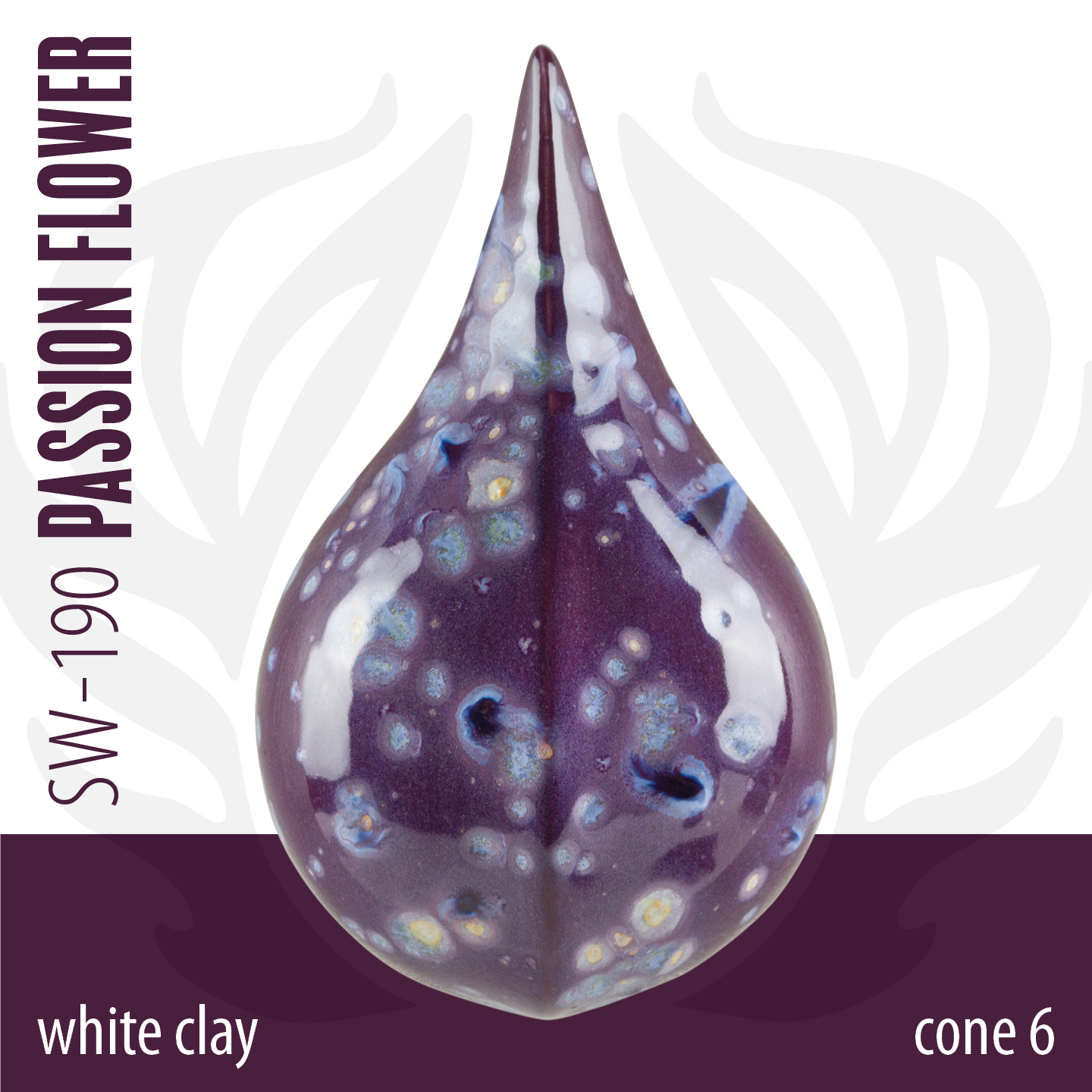 DICA: O vidrado base é o SW-134 Eggplant. Para um efeito de cristais mais leve, aplique 1 camada de SW-190 Passionflower Purple sobre 2 camadas de SW-134 Eggplant. Este vidrado é estável mesmo com aplicações espessas.