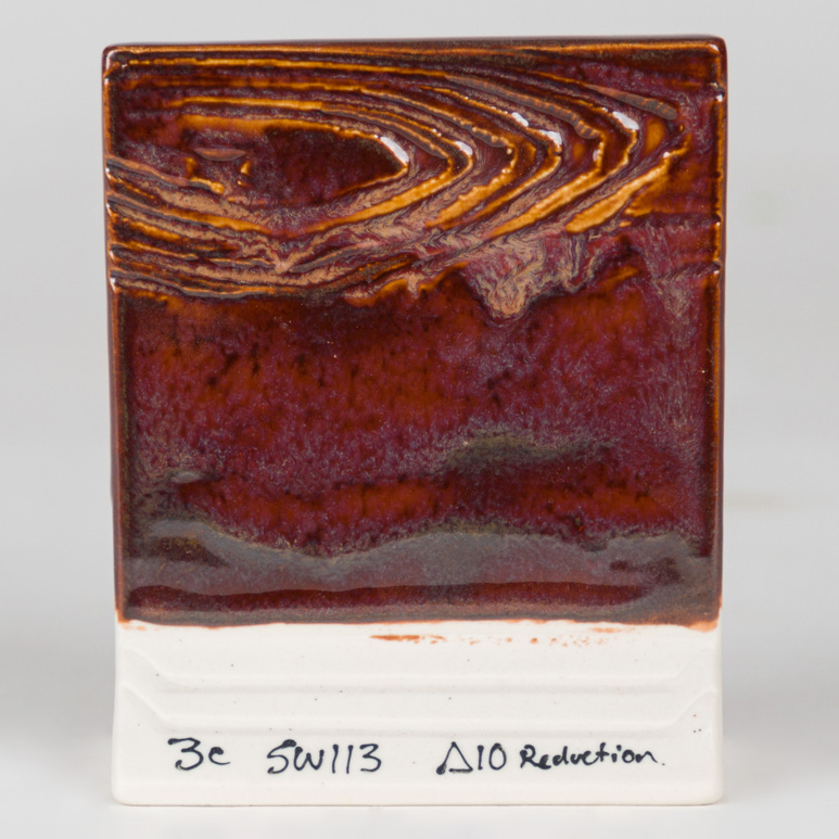 Speckled Plum produz um acabamento brilhante em castanho-avermelhado com uma a duas camadas leves, evoluindo para tons flutuantes de bordô-malva com aplicações mais generosas (três a quatro camadas). Em algumas pastas, aplicações espessas podem também criar bandas de pigmentos em tons avermelhados e malva. Embora apresente belo movimento, o vidrado não escorre da peça numa cozedura em cone 6 oxidação.